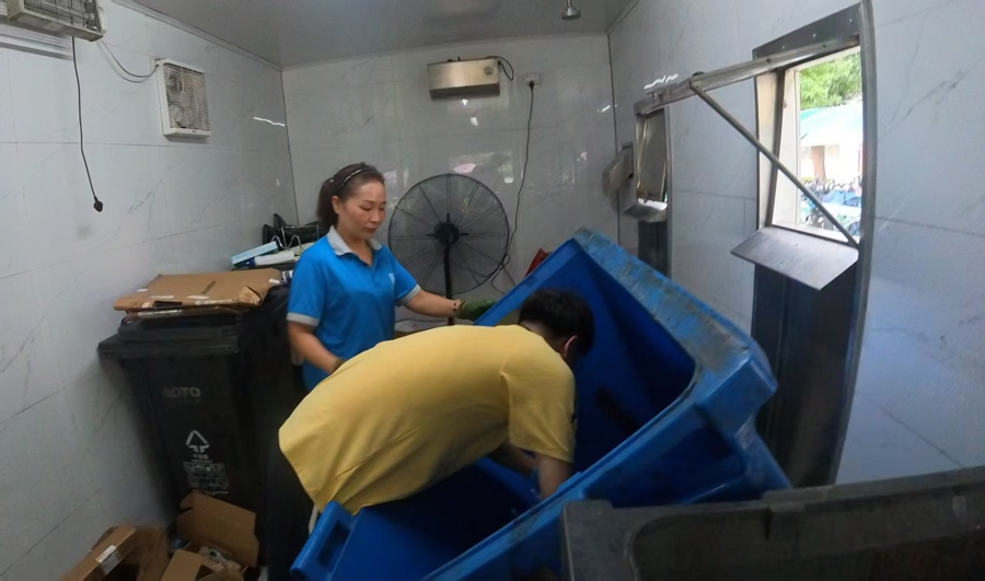 垃圾分类和清运,是开启这场实践的第一课。在清运车的副驾座上,邱比恒接过王师傅递来的手套,指尖传来黏腻的触感,车厢里闷热的气息和垃圾的酸腐味让肠胃翻涌,但这些“不适”很快变得无关紧要,“师傅们每天都干的活,我们也能干。”倾斜45度,用膝盖抵住,再用腰压住,为了掏空大号垃圾箱加速分类工作,李亚迅速掌握了秘诀;亲手翻动每一个塑料袋,饮料瓶里的残液、外卖盒里发馊的汤汁、腐烂的水果在指尖流动,从“制造者”到“处理者”秦乐闻看到熟悉的外卖包装时,心里咯噔了一下。“那一天,我们学会如何遥控垃圾车,知道了西区所有的垃圾箱点位,又热又臭的环境让我们直观地认识到干净美丽的校园由谁守护。”邱比恒说。